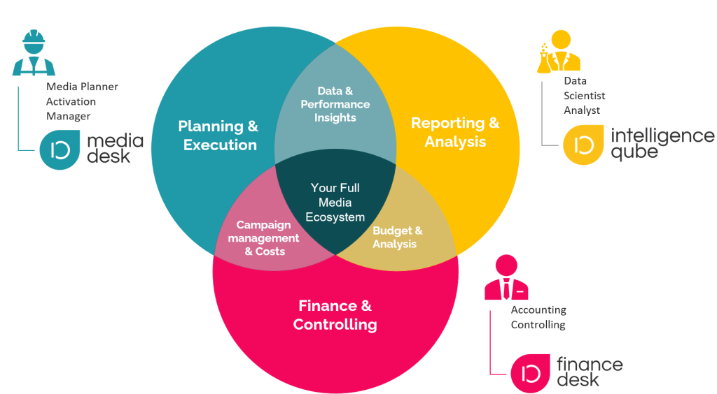 Der technologische Kern ist ein End-to-End Campaign Management System, das den gesamten Prozess von Planung und Buying bis Ad-Management und Reporting abbildet. Ergänzend empfehlen sich eine Daten-Aggregationsplattform für zentrales Reporting über alle Kanäle sowie ein automatisiertes Finanzmanagement-System für Rechnungsstellung und ERP-Anbindung. Media Desk, Intelligence Qube und Finance Desk decken alle drei Anforderungen als integriertes Ecosystem ab.